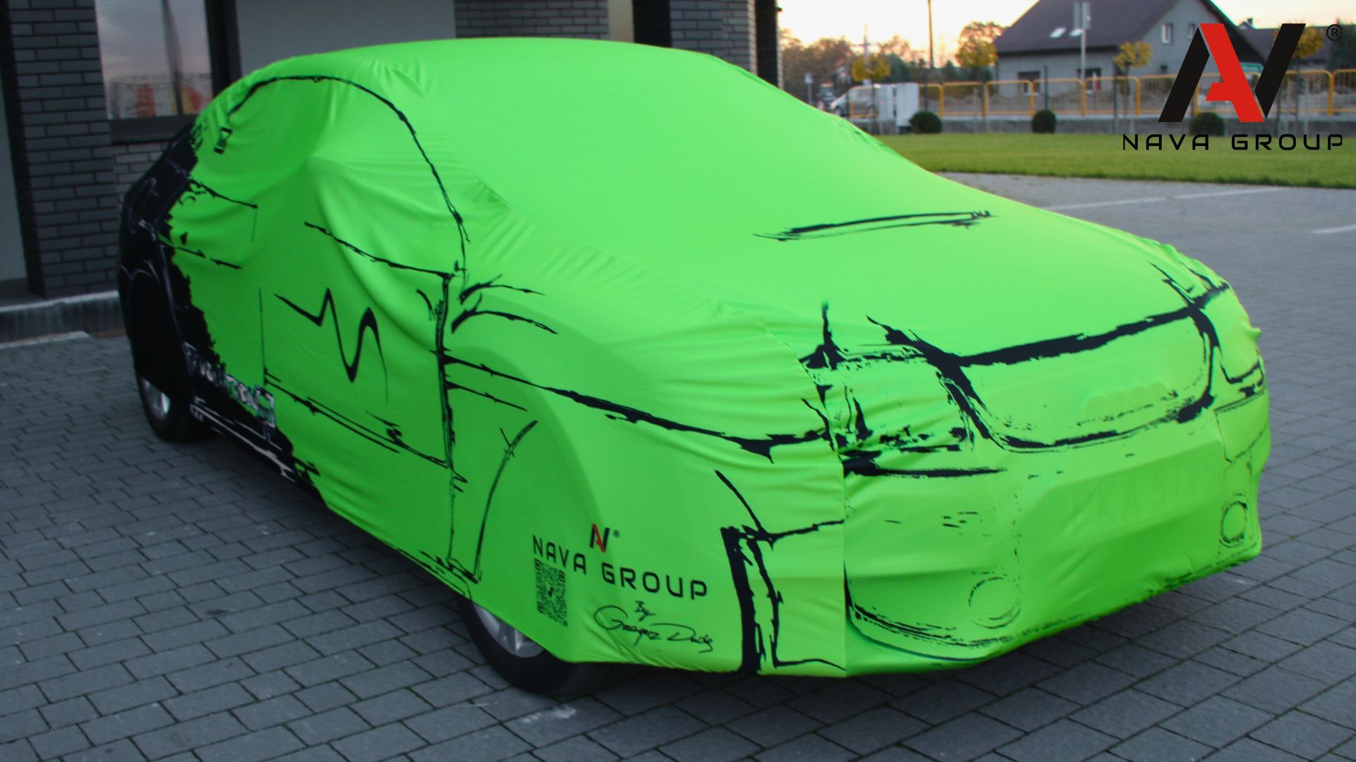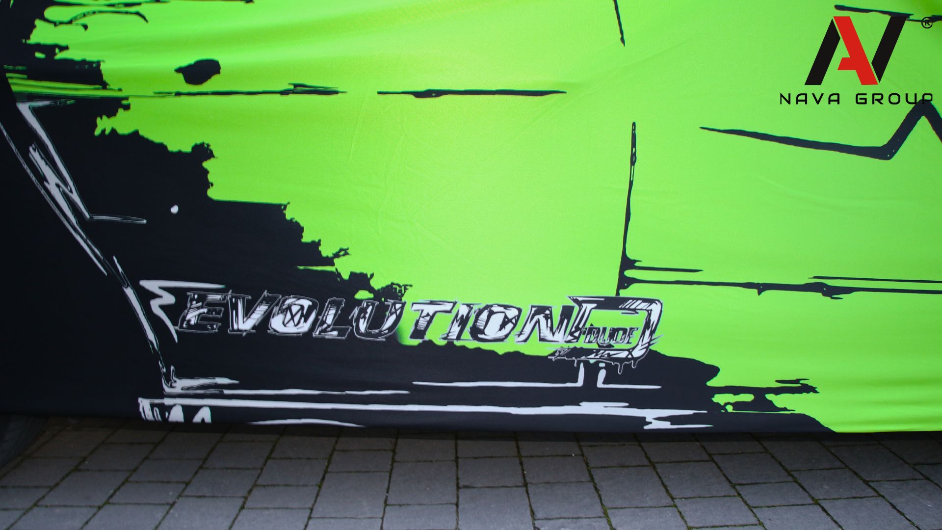 Jedną z takich realizacji jest kultowy Lancer EVOLUTION. Realizacja ta to jeden z najbardziej nietypowych a zarazem satysfakcjonujących projektów, a to za sprawą przeniesienia indywidualnej grafiki samochodu na bezpośrednio na pokrowiec.