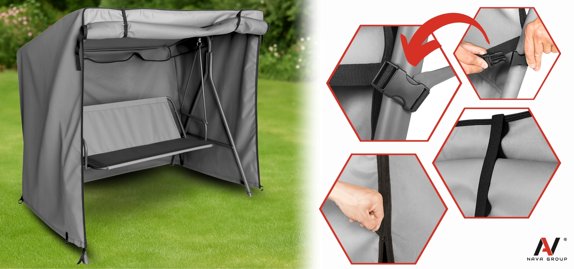 Pokrowiec na huśtawkę ogrodową marki Nava Group to trwała, całoroczna osłona, która skutecznie chroni sprzęt przed deszczem, słońcem, kurzem i zabrudzeniami. Dzięki wytrzymałej tkaninie z filtrem UV, wygodnemu systemowi mocowania oraz solidnym szwom z lamówką, zapewnia nie tylko ochronę, ale też wygodę użytkowania i estetyczny wygląd. Sprawdzi się zarówno w ogrodzie, jak i pod zadaszeniem – wszędzie tam, gdzie huśtawka wymaga zabezpieczenia przez dłuższy czas.
