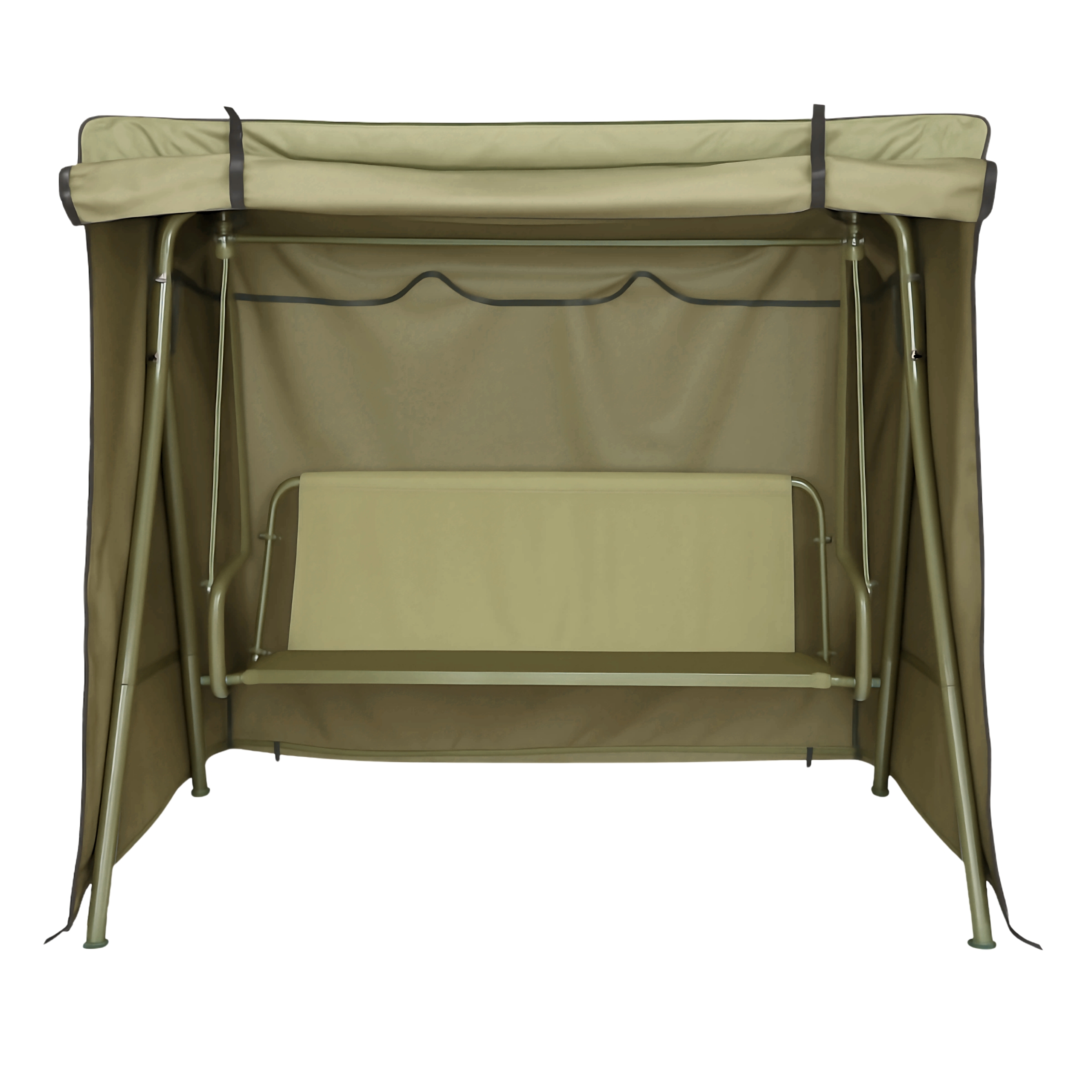 Pokrowiec zakrywa całą huśtawkę, chroniąc ją i porządkując przestrzeń. To szczególnie istotne poza sezonem – gdy sprzęt nie jest w użyciu, ale nadal pozostają na widoku na tarasie czy w ogrodzie.
