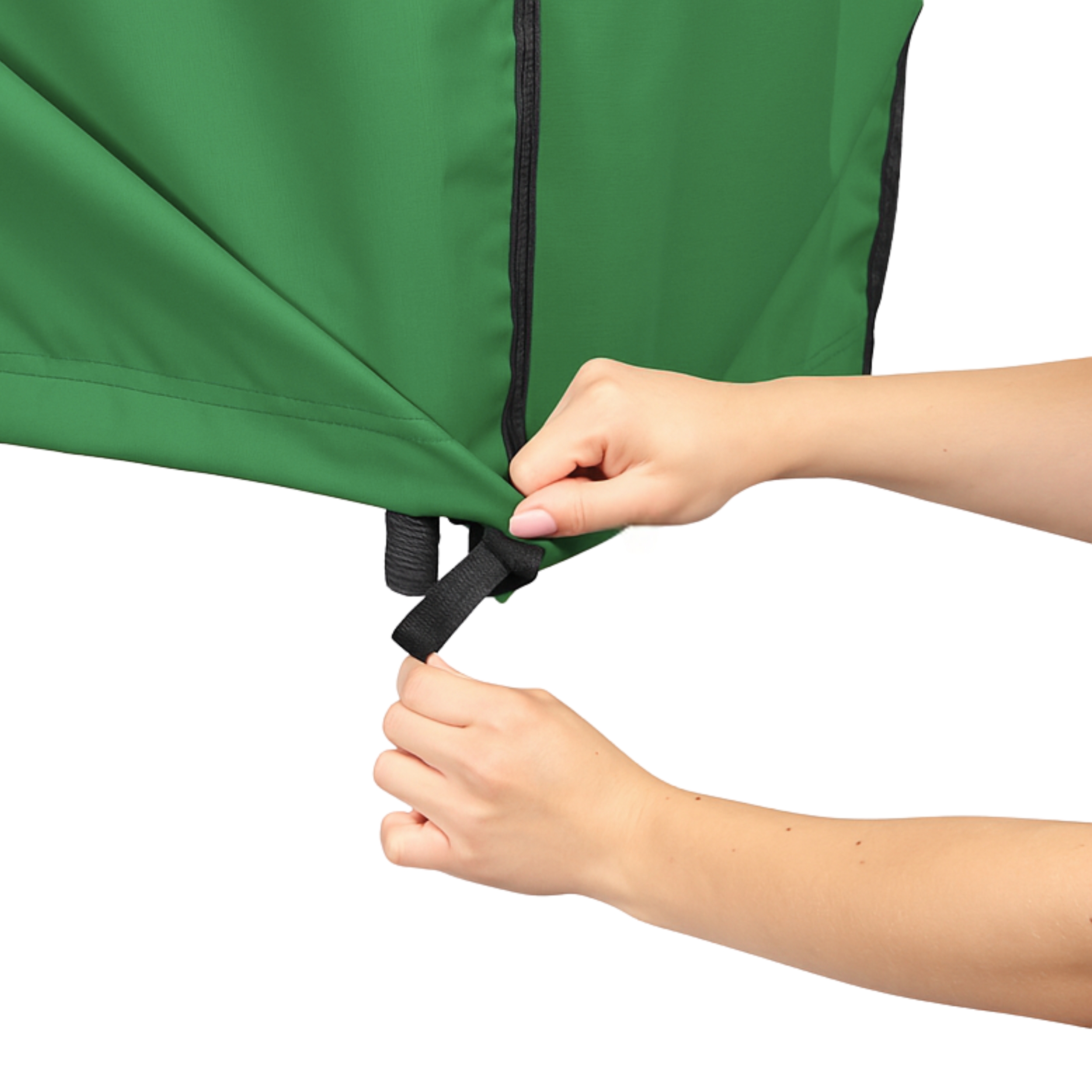 Wszyty ściągacz w formie pasa pozwala dopasować pokrowiec do kształtu mebli, co ogranicza podwiewanie. Oczka w dolnej części (które mogą być zakładane na nogi stołu lub skrzyni) stanowią dodatkowe zabezpieczenie.