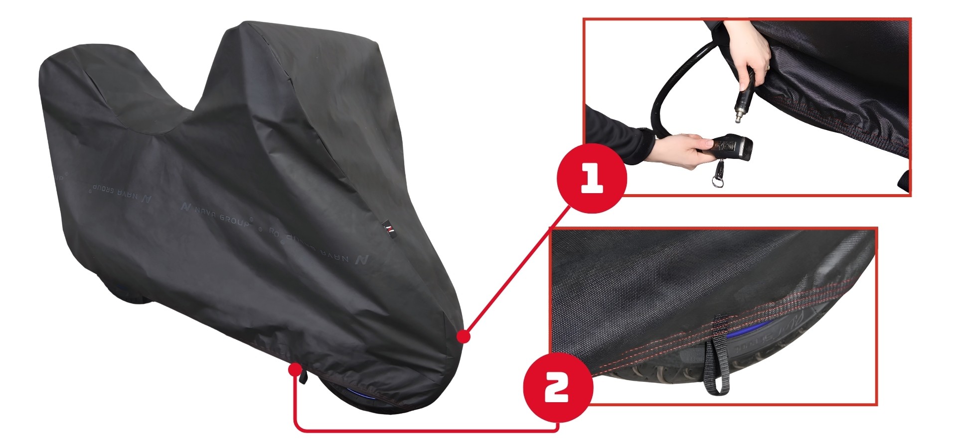 ✅ Odporność na deszcz i śnieg – materiał pokrowca jest trudno przemakalny i odporny na opady o niewielkim lub umiarkowanym natężeniu. Chroni motocykl przed wilgocią, kurzem i zalegającym śniegiem, jednocześnie pozostając paroprzepuszczalny, co zapobiega kondensacji i korozji. Podczas długotrwałych lub intensywnych opadów może wystąpić częściowe zawilgocenie powierzchni motocykla – nie wpływa to na funkcjonalność pokrowca.