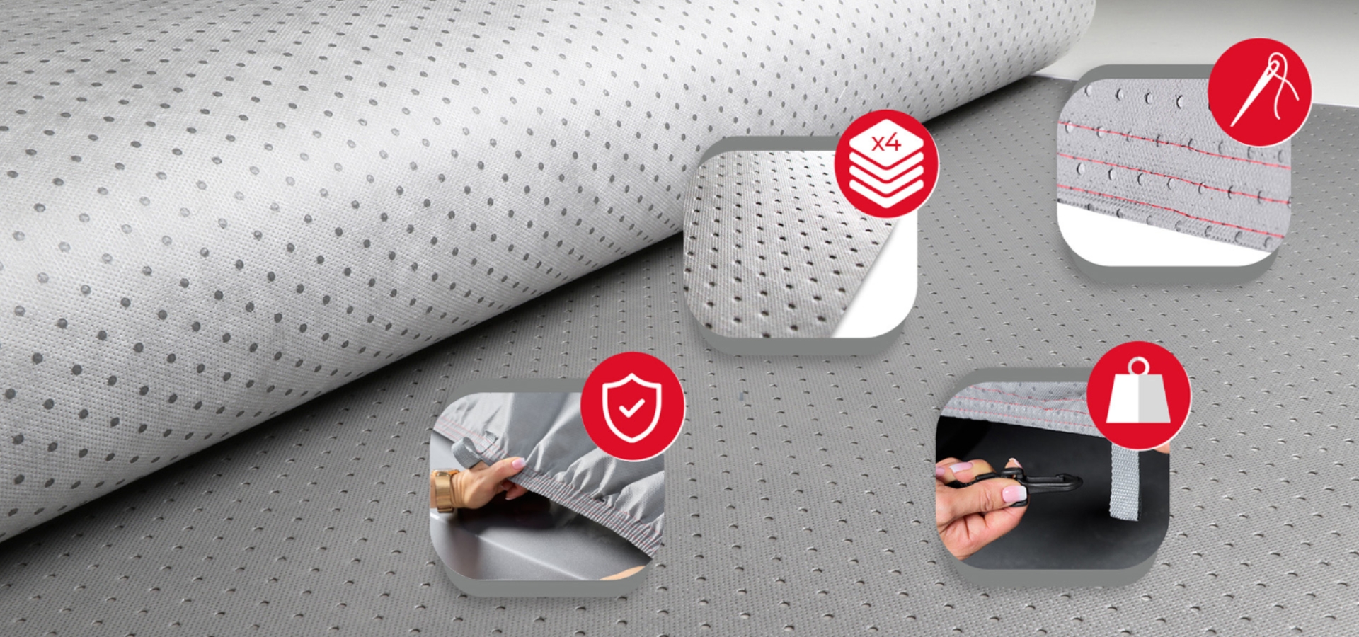 Pokrowiec Exclusive wykonany jest z materiału wielowarstwowego (4-warstwowego). Taka budowa zwiększa poziom ochrony oraz trwałość materiału podczas długotrwałego użytkowania.