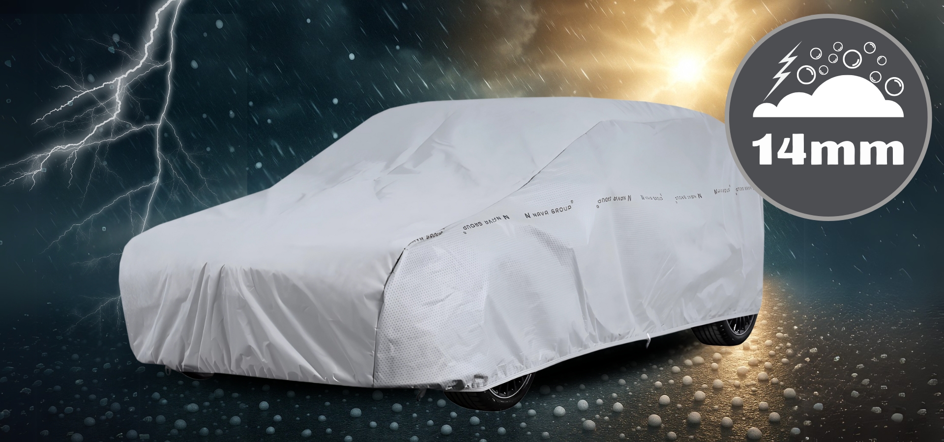 ✅ 5-warstwowa górna część pokrowca o grubości 14 mm – skutecznie amortyzuje uderzenia gradu, chroniąc najbardziej narażoną część karoserii przed wgnieceniami.