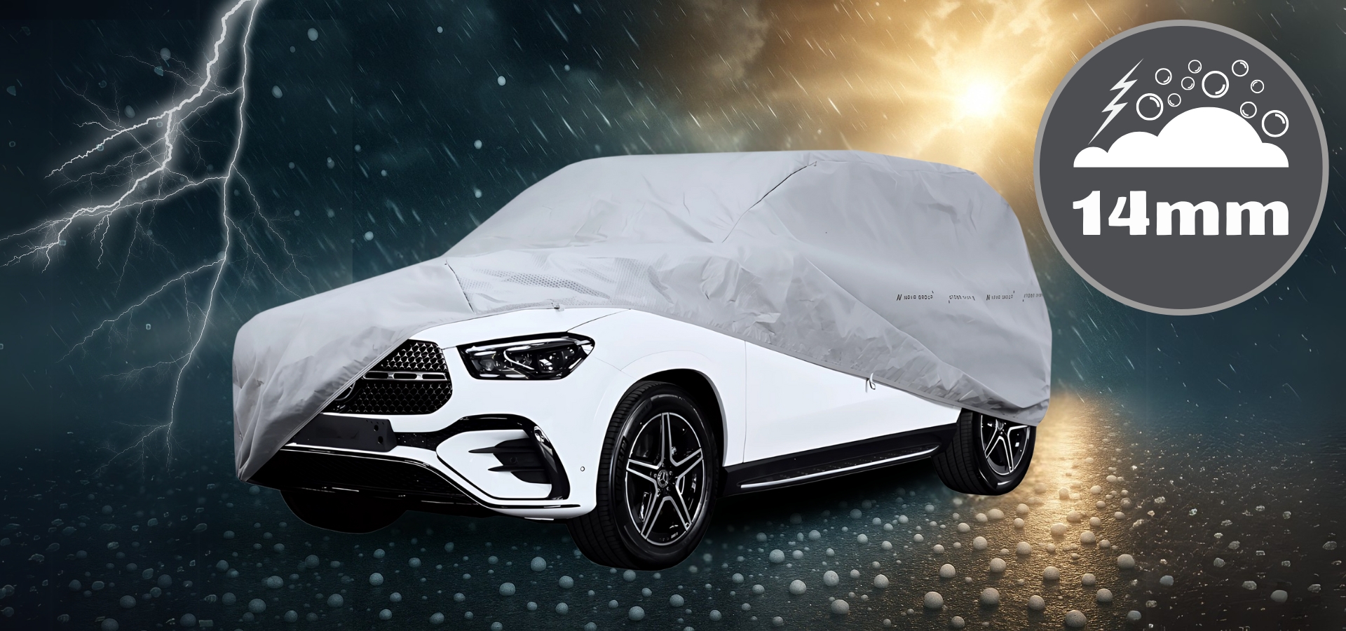 ✅ 5-warstwowa górna część pokrowca o grubości 14 mm – skutecznie amortyzuje uderzenia gradu, chroniąc najbardziej narażoną część karoserii przed wgnieceniami.