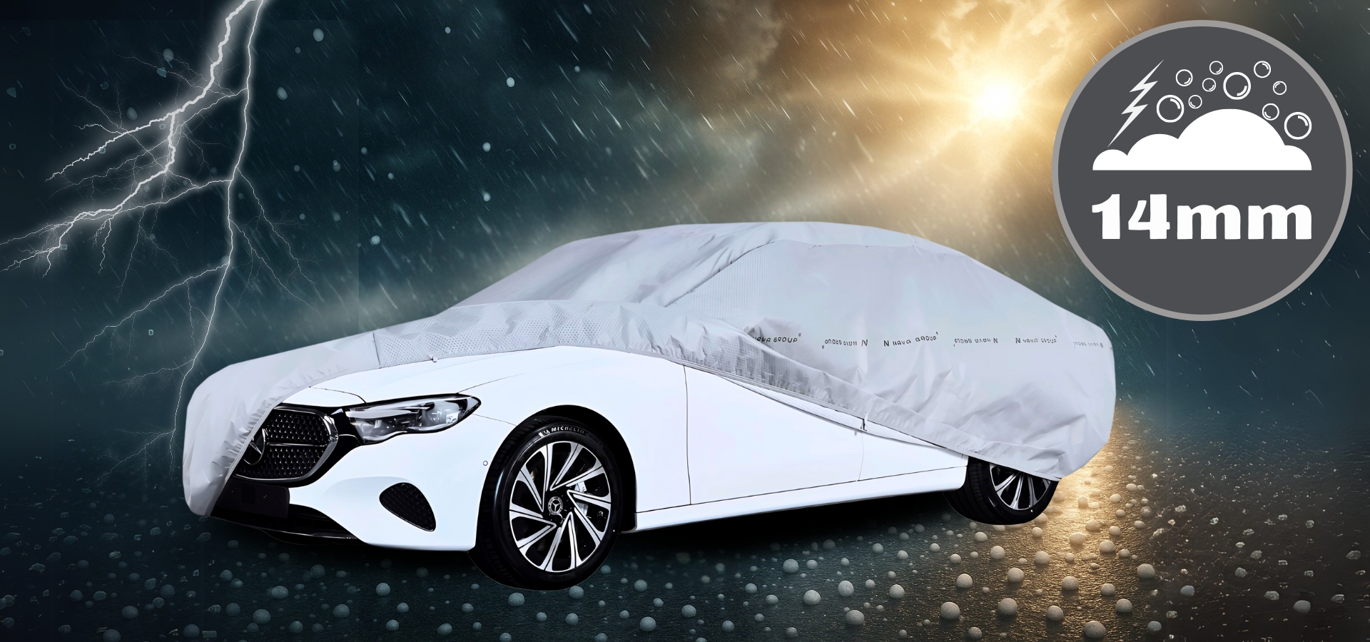 ✅ 5-warstwowa górna część pokrowca o grubości 14 mm – skutecznie amortyzuje uderzenia gradu, chroniąc najbardziej narażoną część karoserii przed wgnieceniami.