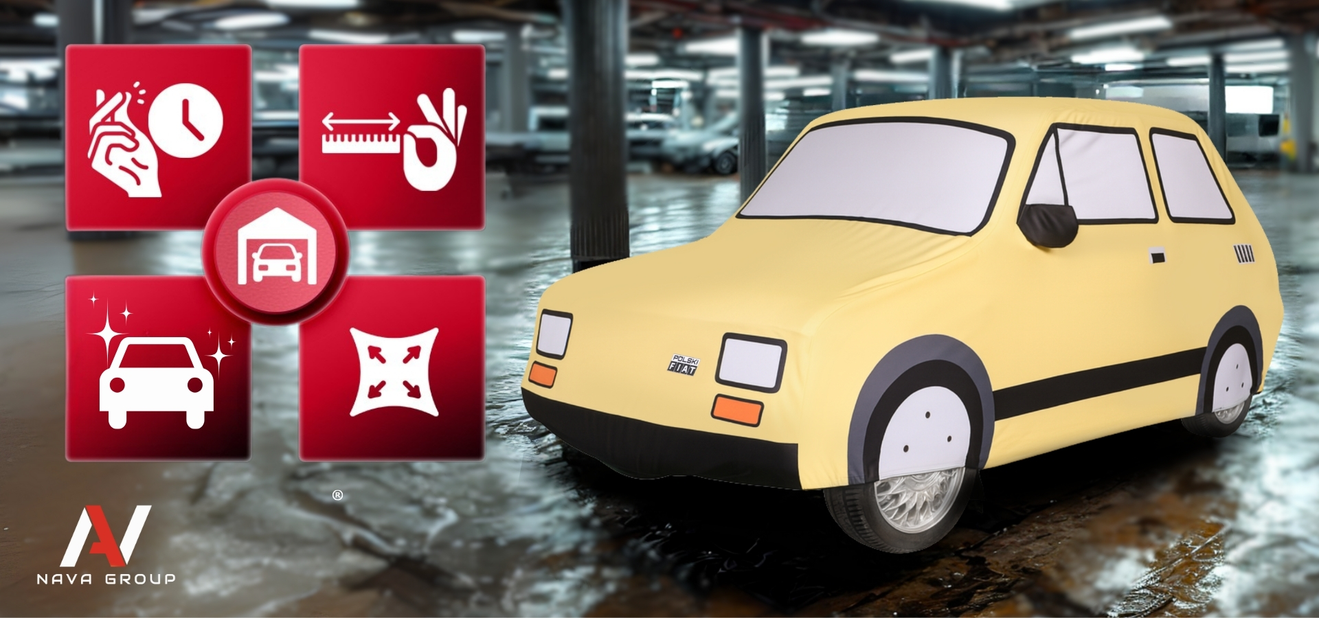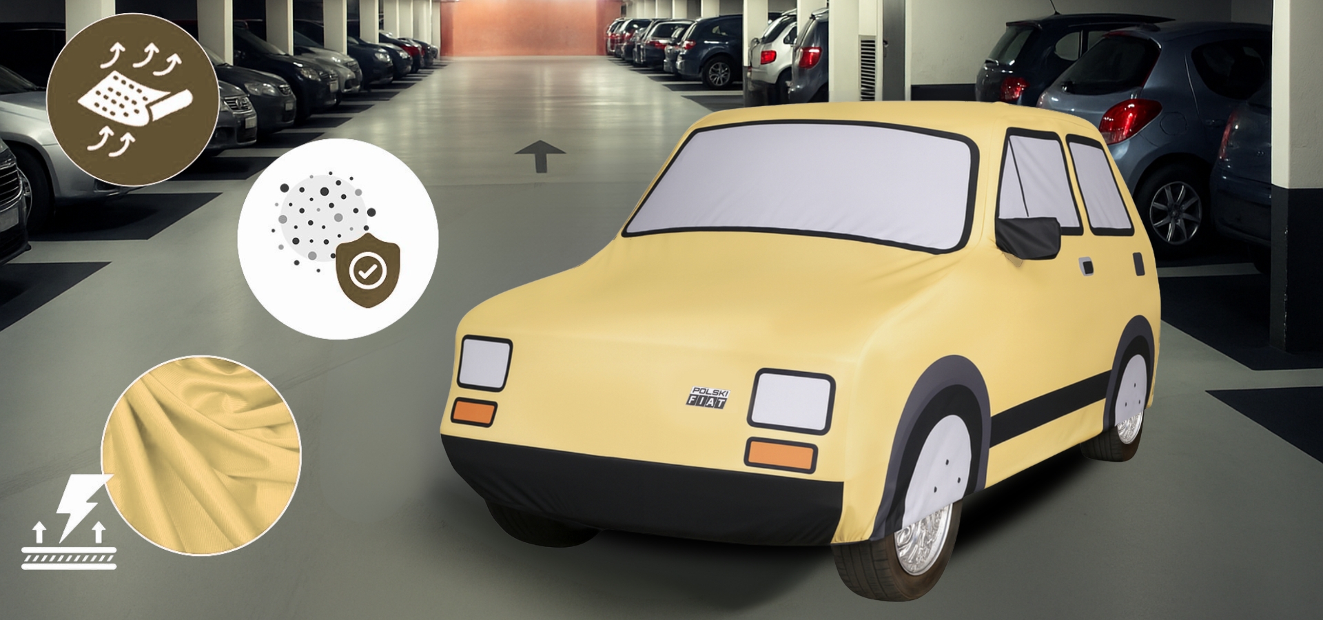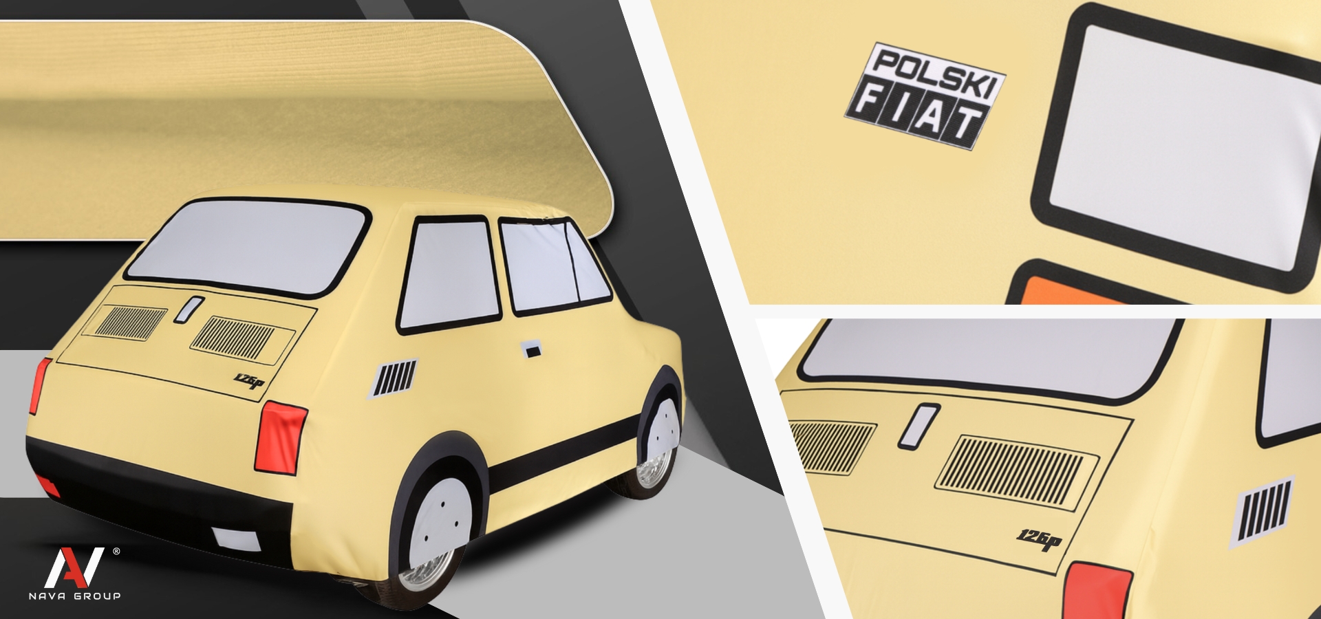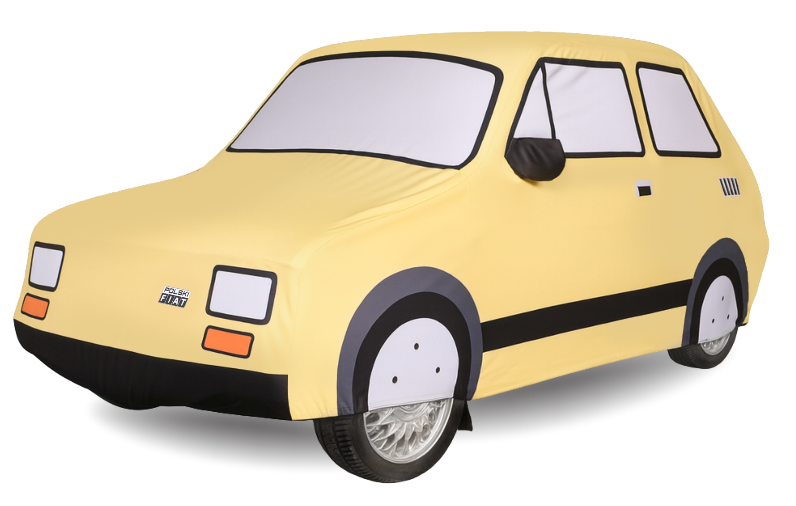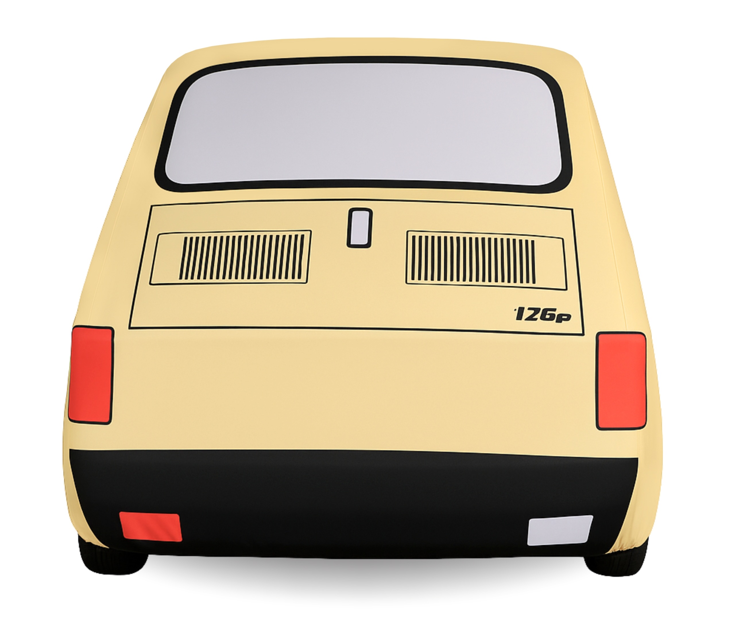 Pokrowiec wykonany został z miękkiej, elastycznej tkaniny, która doskonale dopasowuje się do kształtów samochodu, tworząc elegancką i idealnie przylegającą formę. Unikalny nadruk, wzorowany na sylwetce Fiata 126p, oddaje wszystkie jego charakterystyczne detale – reflektory, szybki, listwy i proporcje nadwozia – tworząc efekt realistycznego odwzorowania kultowego „Malucha”.