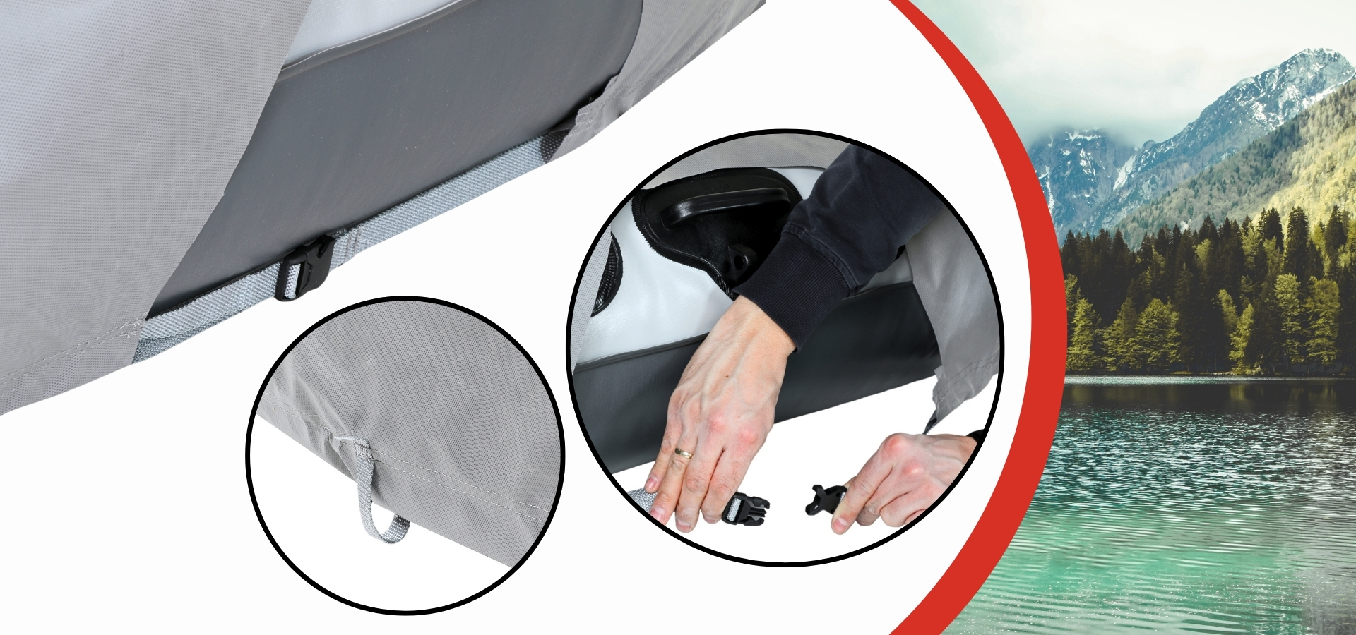 Dodatkowo w konstrukcji zastosowano oczka, które pozwalają na zastosowanie dodatkowych pasów stabilizujących. Dzięki temu pokrowiec pozostaje na swoim miejscu nawet podczas silniejszego wiatru lub w trakcie dłuższego przechowywania sprzętu na zewnątrz.
