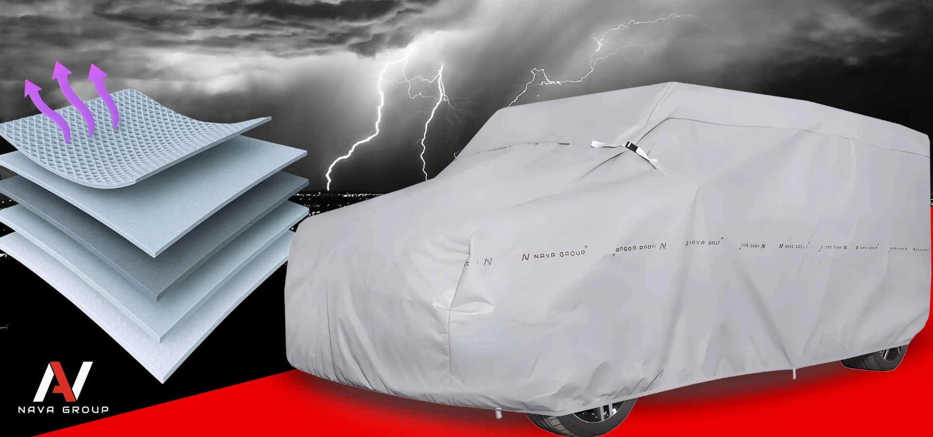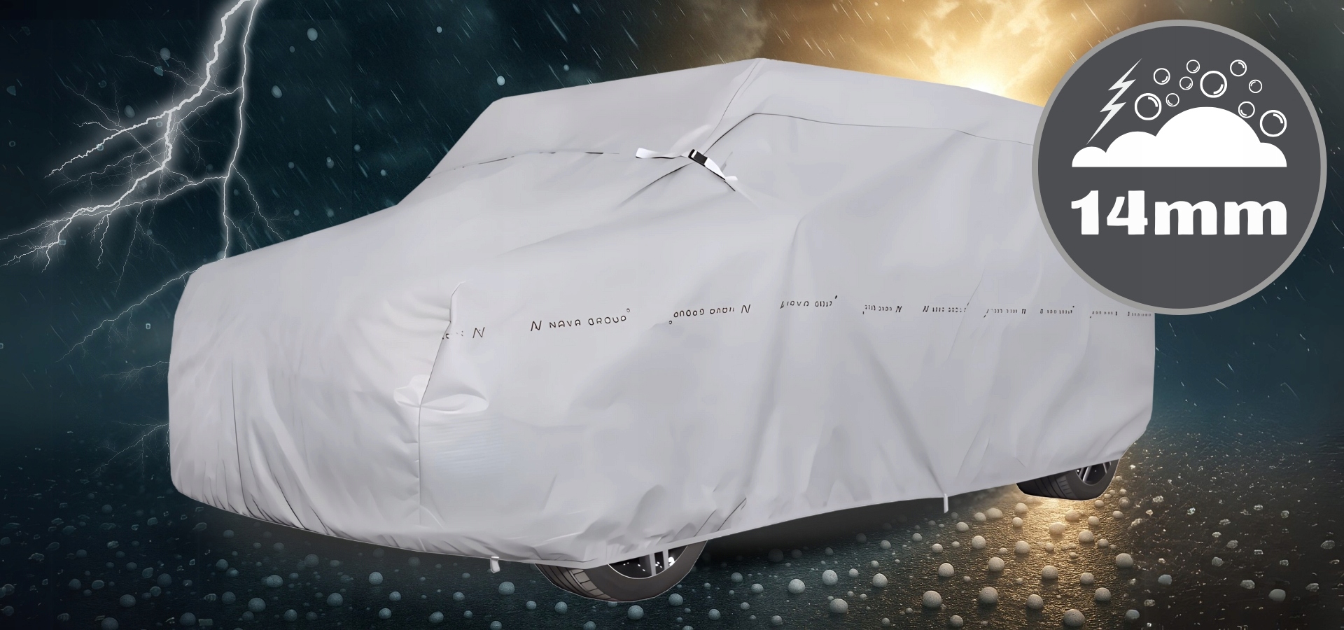 Zbudowana z warstw amortyzujących, w tym grubej pianki ochronnej – skutecznie chroni górne partie nadwozia przed wgnieceniami spowodowanymi gradem.