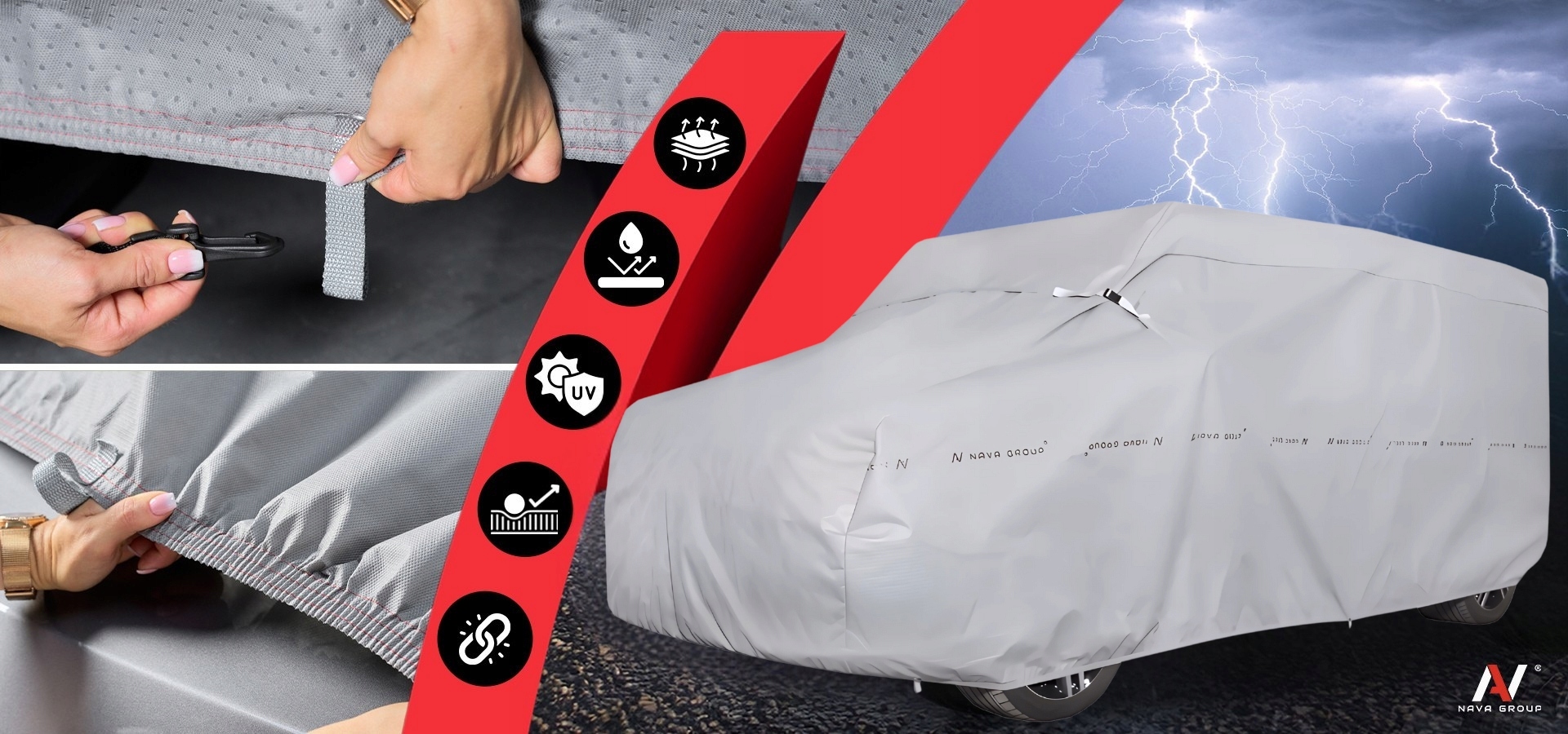 System mocowania zastosowany w pokrowcu przeciwgradowym NAVA GROUP to gwarancja stabilności, bezpieczeństwa i wygody, nawet w najtrudniejszych warunkach atmosferycznych. Twój samochód zawsze pozostanie dobrze chroniony!