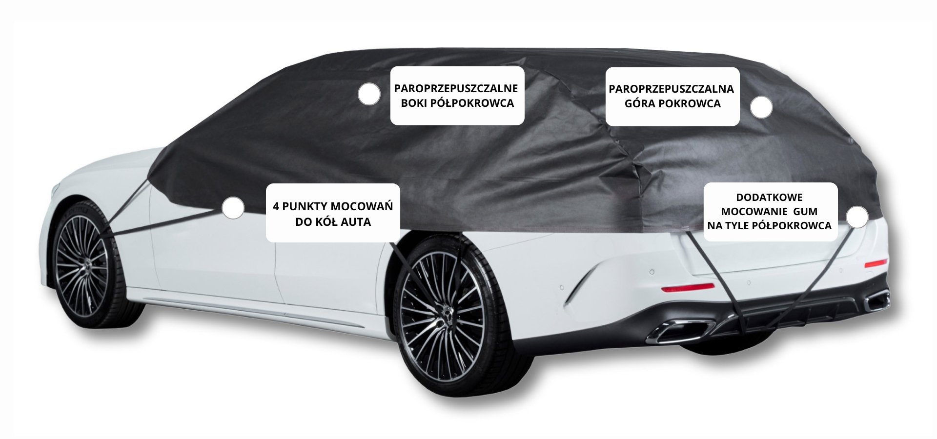 Półpokrowiec gwarantuje bezpieczne przykrycie pojazdu zarówno na zewnątrz jak i wewnątrz.