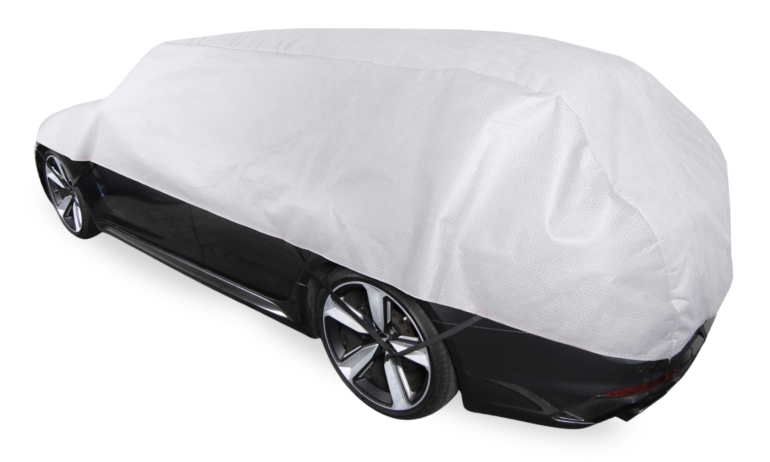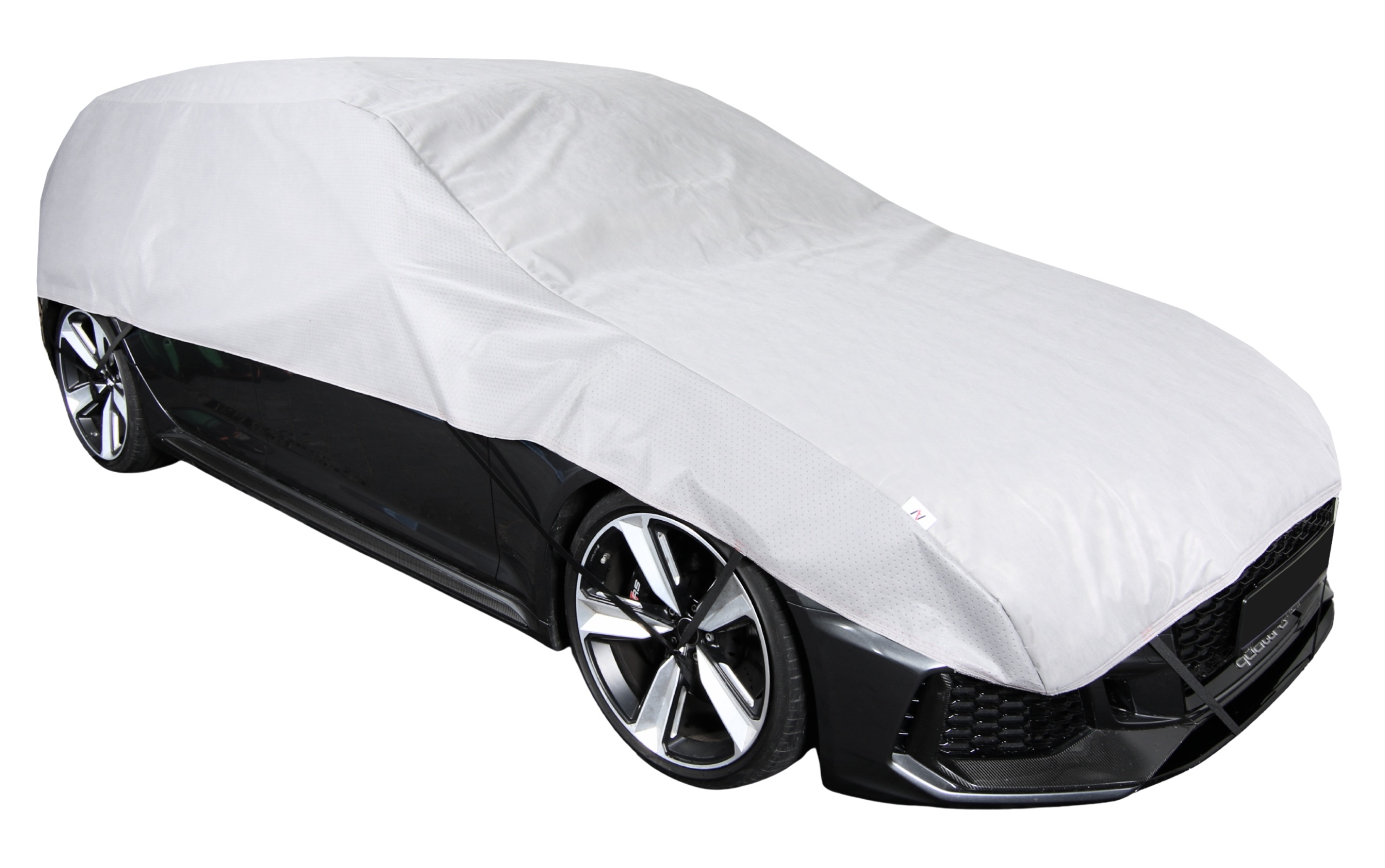 Półpokrowiec wyposażony jest w system 6-punktowego mocowania z elastycznymi gumami, które zaczepia się wokół kół oraz przedniej i tylnej części pojazdu, co stabilizuje materiał nawet podczas wiatru.